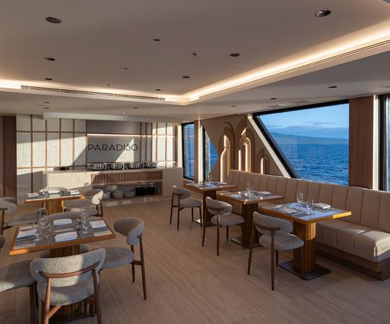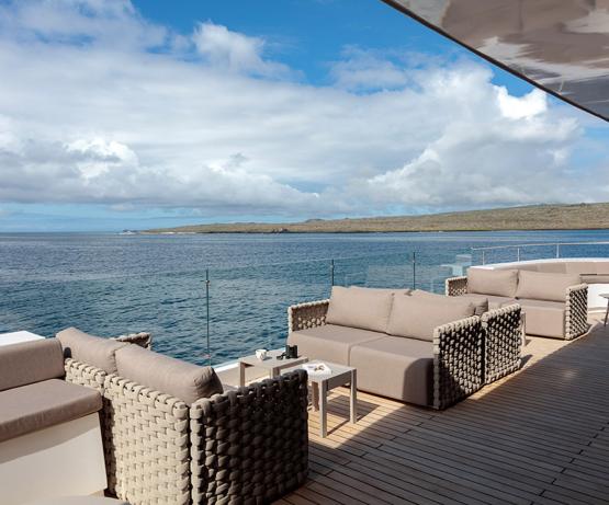 Inclus : Hébergement en suite double ou individuelle, menu signature d'un chef renommé, boissons alcoolisées et non alcoolisées du menu sélectionné, utilisation de la bibliothèque, utilisation du hammam, démonstrations de cocktails et de cuisine, service de majordome, service de blanchisserie (articles limités), frais d'entrée dans le parc national et carte de contrôle des transports en commun, mini-bar, service de déballage de vos affaires personnelles, accès au salon VIP de l'aéroport des Galápagos, assistance à l'aéroport pour les vols vers les Galápagos les jours de départ de la croisière, Internet par satellite, combinaison de plongée et équipement de plongée avec tuba, Stand Up Paddle, kayak, bâtons de marche, toutes les activités et excursions décrites dans les itinéraires en compagnie d'un guide naturaliste anglophone et hispanophone.
